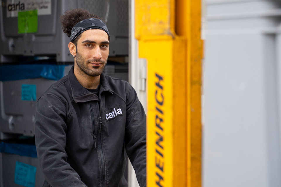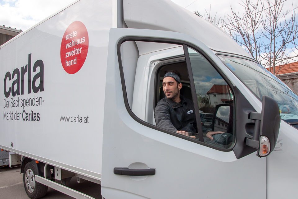 Fariborz Khams Abasi (30) war in seiner Heimat Iran Industriedesigner. Als er vor einigen Jahren nach Österreich floh, musste er alles zurücklassen. Während er hier auf seinen Asylbescheid wartete, durfte Fariborz nicht arbeiten. Da er nicht untätig sein wollte, kam er als Freiwilliger zur Caritas. Für die Carla transportiert er nun Sachspenden zwischen Lager und Läden.